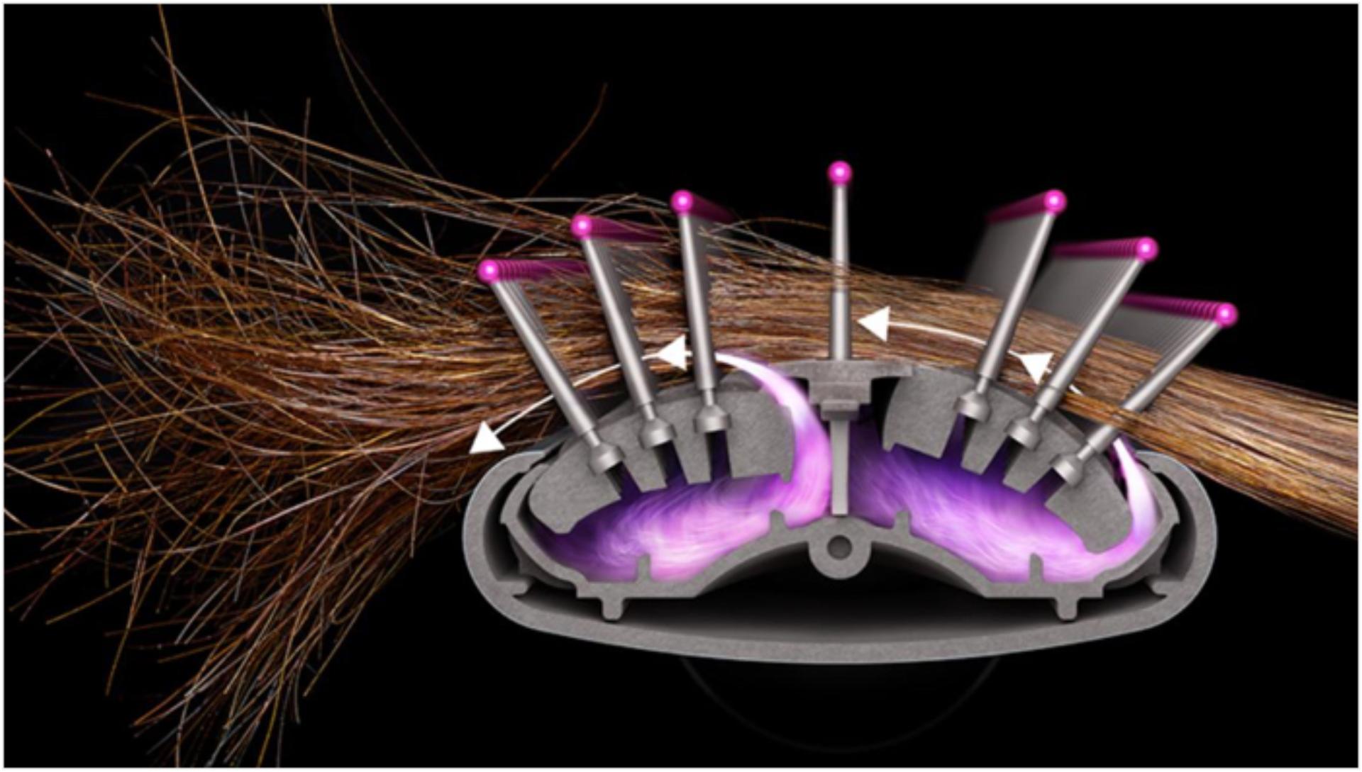 Dyson順滑造型梳透過康達效應將頭髮引至 髮梳表面,沿著髮束推動空氣,仿效髮型師吹整頭髮的技術。